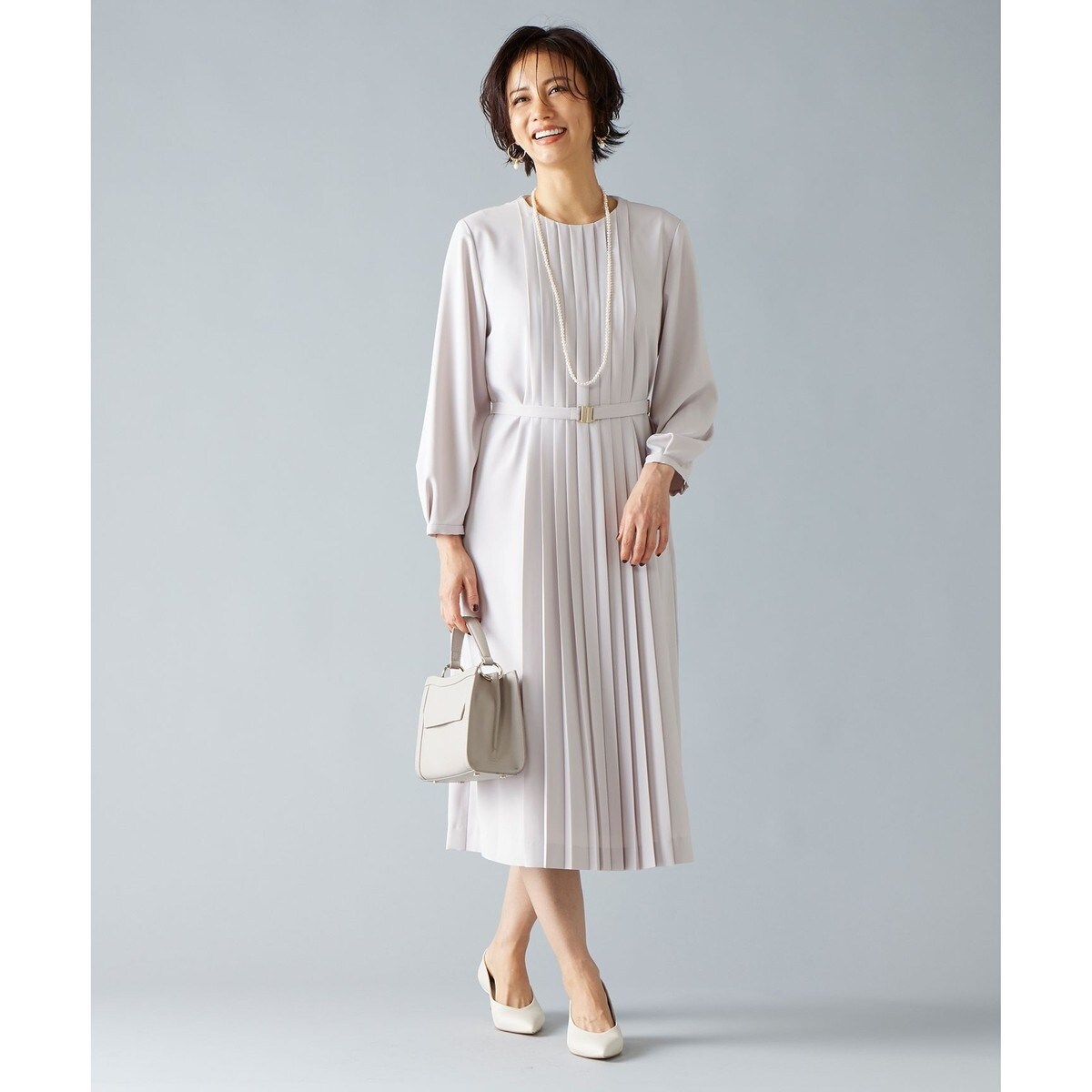 前後のプリーツデザインが華やかなワンピース■デザインフロントとバックにプリーツを施したワンピースです。ストンと落ちるシルエットなのでボディラインが気になりにくく、プリーツを中心に入れることで縦のラインが強調されるのでスタイルアップ見えが叶います。共ベルトでウエストマークをした着こなしもおすすめです。オフィス、フォーマルのシーンで使いやすい落ち着いた無地2色展開です。■素材ポリエステルのツイル素材です。適度な肉感で、ハリ感とドレープ性があります。マットな質感とソフトな風合いで、ナチュラルなストレッチ性があり着心地の良い素材です。シワになりにくいのもポイントです。