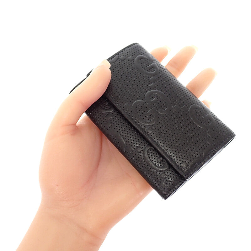 上質なブラックレザーにグッチを象徴するGGパターンをエンボス加工で施したデザインが目を惹くアイテム。