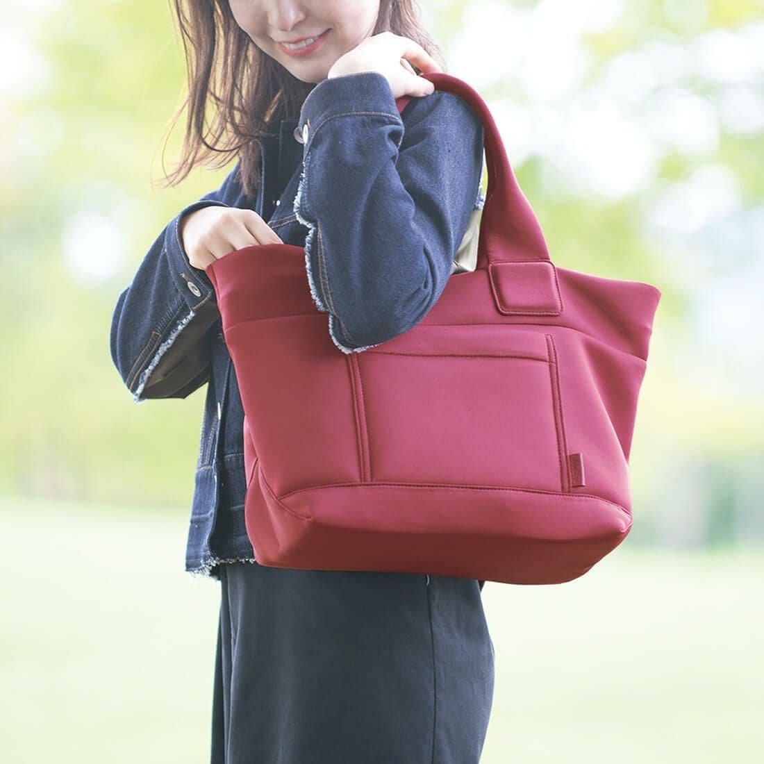 ふっくらとしたボリューム感のある軽量の生地を使用したトートバッグ。程よい伸縮性のあるウェットスーツ風の生地を使用した太めのハンドルが腕や肩への負担を軽減してくれます。メイン収納部は安心のファスナータイプを採用しました。正面のオープンポケット右下にはロゴを型押ししたバッグと同色のタグが付いています。マチが広くて、たっぷり収納できるので、ジムや旅行、仕事などあらゆるシーンで活躍するバッグです。