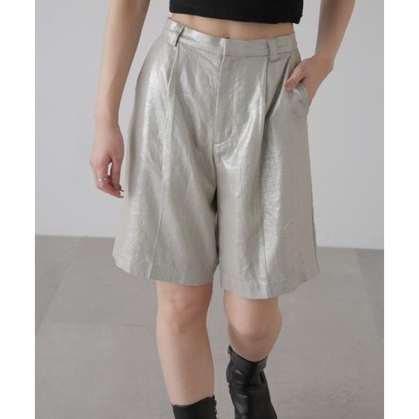 インパクトのある箔プリントのシャイニー素材のハーフパンツ。ナチュラルな表情の麻混の素材にメタリックな箔プリントで軽い雰囲気のある今年らしいファブリックです。程よいゆるめシルエットで体のラインを拾いにくく、裏地付きで透けづらいのもポイント。Tシャツをウエストインしたり、ビッグシャツ合わせでゆるっとシルエットでカジュアルなコーデがおすすめです。※モデルの着用画像の場合、光の当たり具合により、実際の色味と異なって見えることがございます。色味は、商品単体の画像をご参照ください。