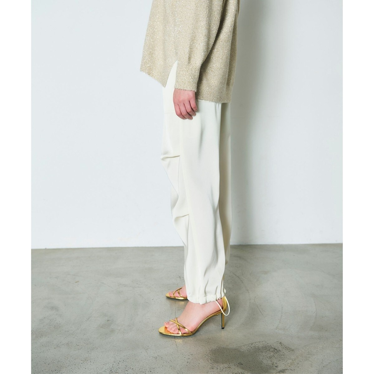 滑らかなサテン素材でお作りした、綺麗めに穿けるワークパンツ。タックを入れて裾にドロストを入れた抜け感シルエットが、大人のリラックスした休日スタイルにぴったり。カットソーやニットでカジュアルに合わせるのはもちろん、あえてヒールを合わせてフェミニンにまとめるのも今年らしくておすすめです。