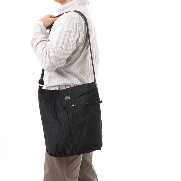 ショルダーバッグはシンプルなデザインながら、内装に3つ、外装に1つのポケットを備えた機能的なアイテムです。雑誌やA4サイズのファイルが収納できるサイズで、ペットボトルや折り畳み傘などの持ち運びもしやすい縦長フォルムが特徴です。