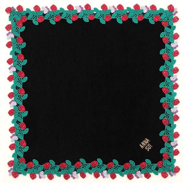 カラフルなレースが華やかなタオルハンカチ。オリジナルデザインのレースとフラットなシャーリング生地を組み合わせ、シンプルでありながらANNA SUIらしさが詰まった1枚に仕上げました。