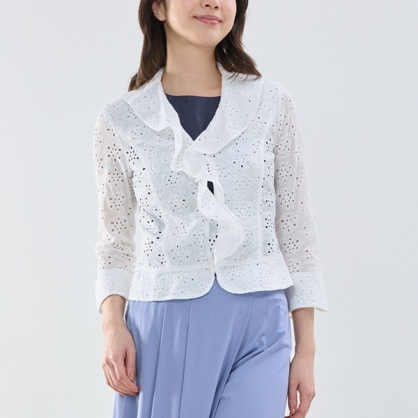 コットンのエンブロイダリーレース生地を使用した七分袖ジャケット。フリルディテールを取り入れたナラカミーチェらしいデザインで、初夏の羽織りとして活躍する1着です。涼しげなレース素材は通気性が良く、やさしい肌触りも魅力。タンクトップやカットソー、シンプルなワンピースにさらりと羽織るだけで、上品で華やかなスタイリングに仕上がります。