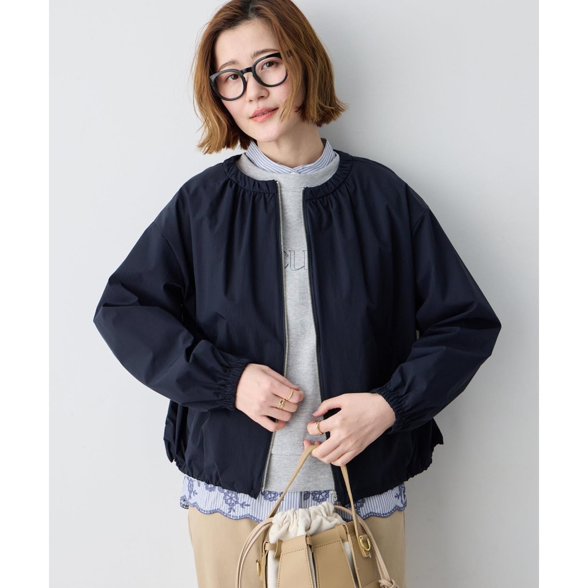 衿元のギャザーデザインが、さりげなく女性らしさを演出するショートブルゾン。
