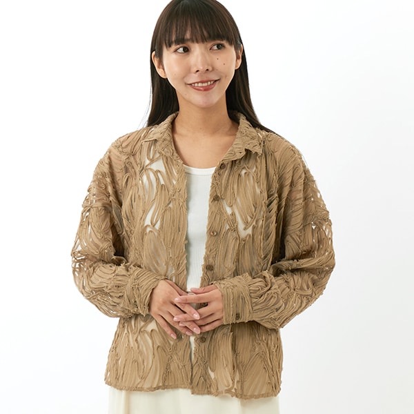 立体感のあるコード刺繍風素材が印象的な、上品なシャツブラウス。