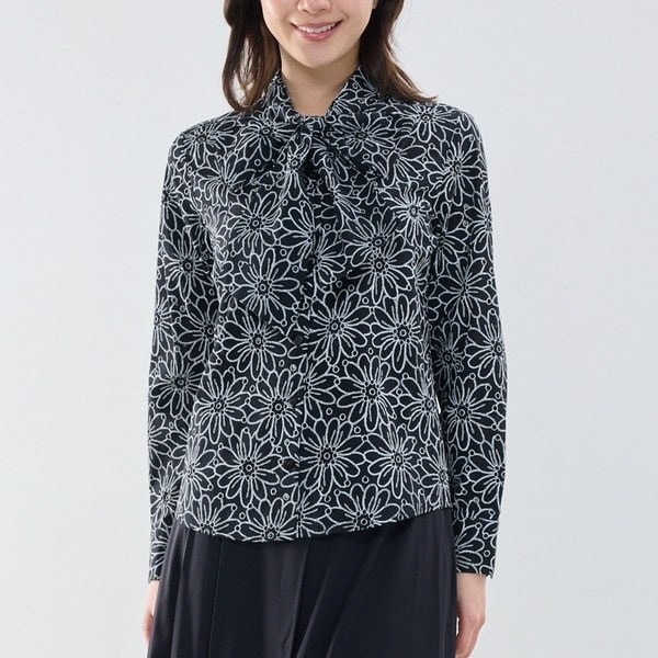 エンブロイダリーレースのような表情を持つ生地を使用した、ボウタイ長袖ブラウス。生地表面にフロッキープリントを施すことで、刺しゅうのような立体感を表現しています。コットン素材ならではのやさしい風合いで着心地も良く、ボウタイデザインが顔まわりを華やかに演出。1枚で着映えし、きれいめからデイリーまで幅広いスタイリングに取り入れやすいアイテムです。