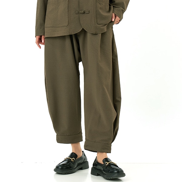 【素材】表面のストライプ状の凹凸感が特徴のサッカー素材はサラッとした肌触りと適度なキックバックがポイント。【デザイン】股上にゆとりを持たせたリラックスシルエットのスラックス。見た目以上の軽さと、サラッとした肌触りでカジュアルにもキレイ目にも使い勝手が良いアイテムです。同素材で作ったジャケットと合わせてセットアップとしても楽しめます。*こちらの商品はユニセックス商品です。【ブランド情報】FRAPBOIS/フラボア2001年にブランドスタート。「大人げない大人の服」をコンセプトに、大人が着るリラックスしたデイリーウェアを提案するコレクションブランド。レディースとメンズのアイテムをご用意しています。