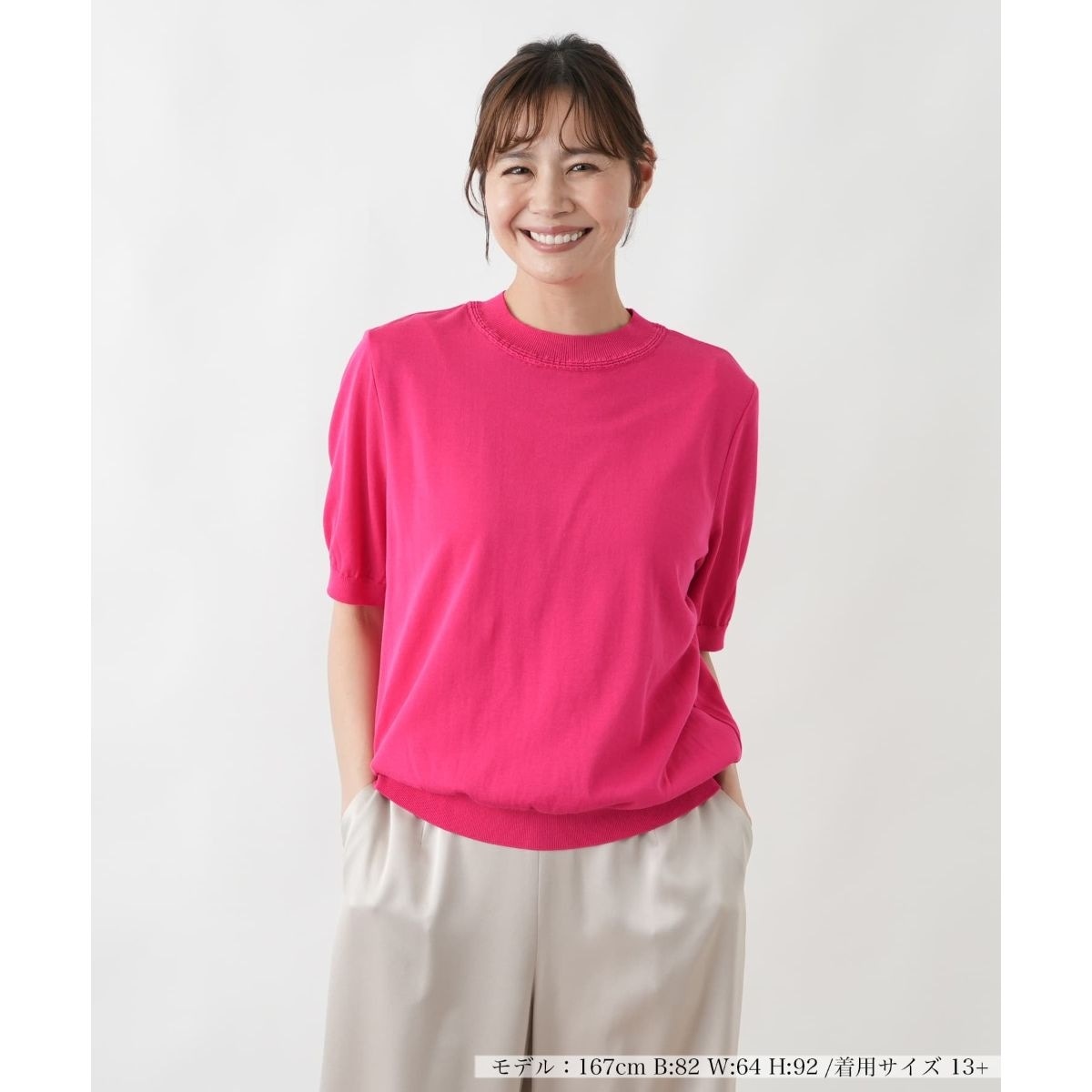 装いの主役になる、鮮やかなフューシャピンクが目を引く半袖ニット。優しい肌触りのコットン混素材で、着心地も快適です。袖口と裾はリブ仕立てにすることで、すっきりと若々しい印象に。シンプルなクルーネックデザインは、スカートにもパンツにも合わせやすく、様々なボトムスとバランス良くコーディネートしていただけます。ご自宅でお手入れが可能なのも嬉しいポイント。同素材のカーディガンと合わせてアンサンブルとして着用すれば、より一層上品で華やかな装いが完成します。