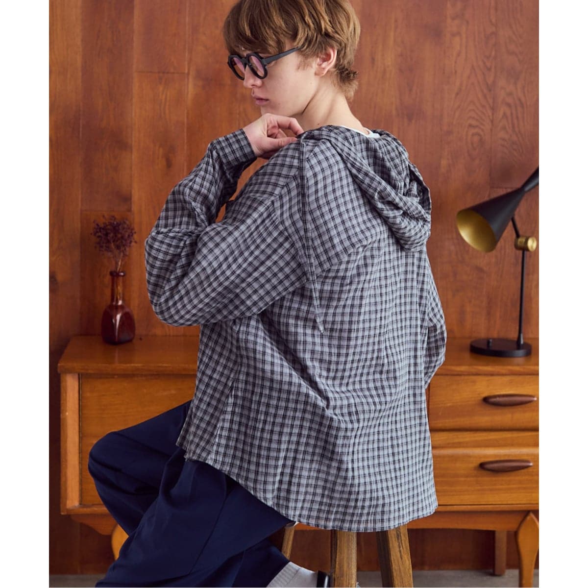 シアー感のある軽やかなチェック生地にフードを組み合わせた、シャツとパーカーの中間のようなユニークなアイテム。