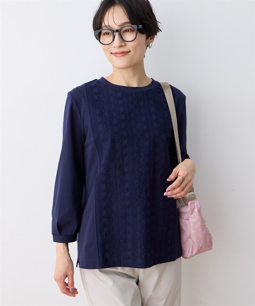 フロントに施した刺しゅうレースが、さりげなく華やかな印象を与える一枚。
