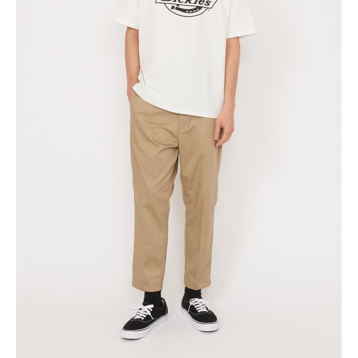 Dickies定番TCストレッチ生地は、ポリエステル64%・コットン34%・ポリウレタン2%の混紡です。程よい伸縮性と柔らかさがあり、動きやすく快適な着心地が魅力の素材です。