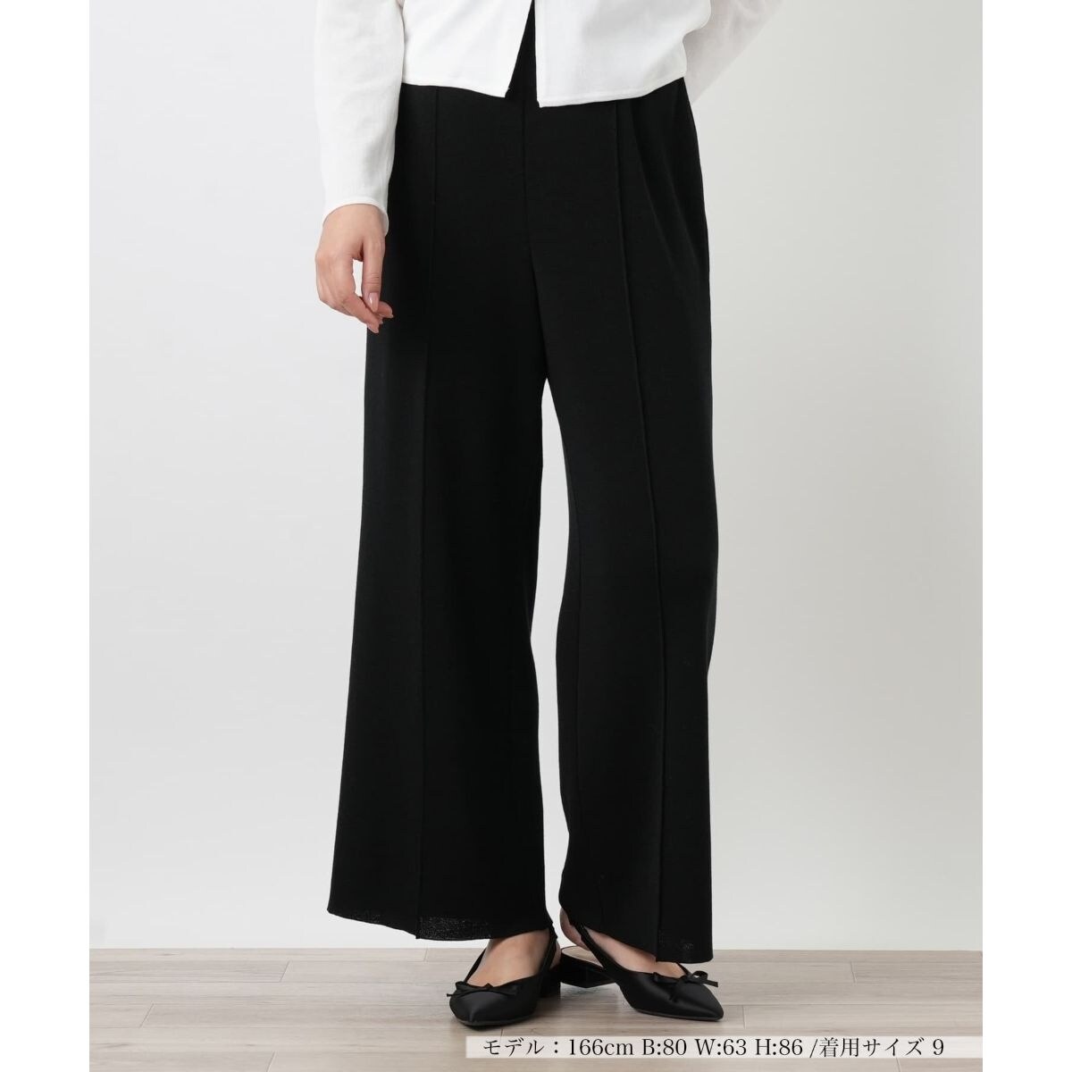 ストレッチ性に優れた、快適な履き心地のニットパンツ。膝が出にくいようセンタークリースを配し、すっきりとした印象に仕上げました。ウエスト部分は3段切り替えのデザインにすることで、イージーパンツに見えない工夫を凝らしています。編み方を変えて透けにくくするなど、細部までこだわった一着です。