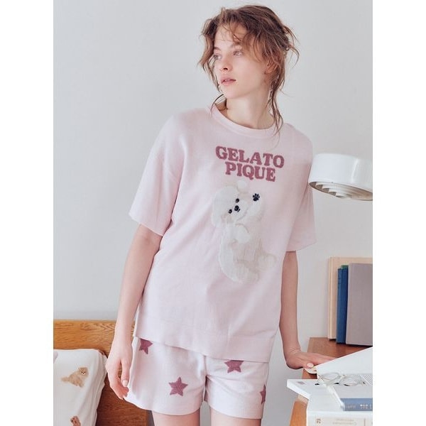 ごろんと寝そべりお腹を見せるワンちゃんが愛くるしい、なめらかでとろけるようなセットアップをONLINE限定でご用意しました。甘えん坊な表情や、ほんのりピンクなお腹の色まで表現した絵柄が、袖を通すたびに心を癒してくれそう。ボトムはキャッチーなスタージャガード入りのショートパンツを合わせました。色は全5色で、トイプードル柄はブルーとピンク、ポメラニアン柄はクリームとベージュ、ビションフリーゼ柄はライトピンクを揃えています。春の新生活へ向けたギフトにもおすすめ。HOMME、JUNIORサイズでも同様のセットアイテムをご用意しています。
