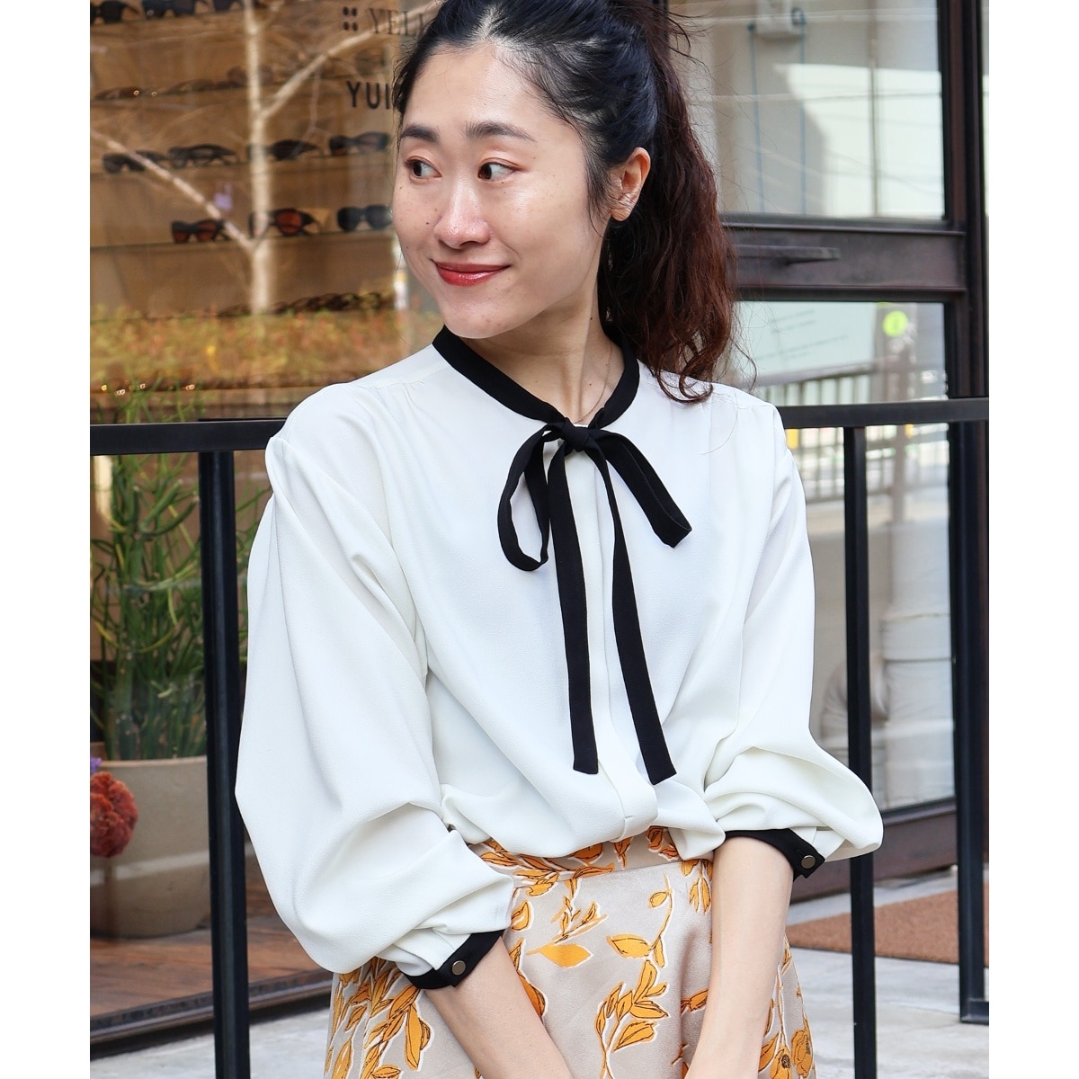 配色ボウタイが目を惹く、クラシカルなブラウス。