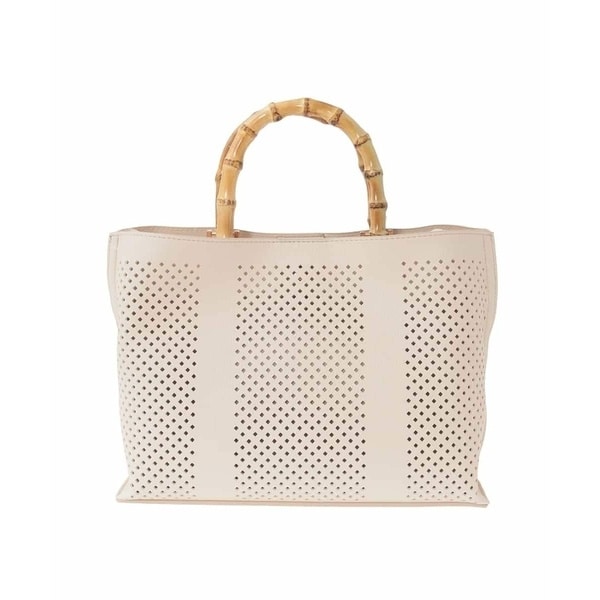 洒落見えアクセントに最適なバンブーハンドルのトートバッグ。洗練された品のある雰囲気にパンチングデザインが抜け感をプラスしてくれるカジュアルユースにも最適なひと品です。コンパクトながらも仕分けに便利なサイド収納を設け、シーンを選ばないショルダーベルト付きの2WAY仕様。ニュアンスあるカラーで春夏スタイルに取り入れやすい今季おすすめのアイテムです。