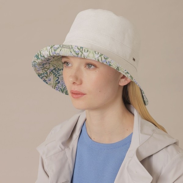 様々なフラワーが咲く様子を繊細に表現したボタニカルウォールプリント生地のリバーシブルハットです。多くの版を使い薄手の綿に捺染で仕上げたこだわりの素材です。無地面は綿麻混ポリエステルで吸汗速乾と通気性に優れた素材です。クラウンにUVカット芯、ブリムに一級遮光芯を入れてあり、紫外線対策に最適です。コーディネートによってお好きな方を表にしておかぶりいただけます。