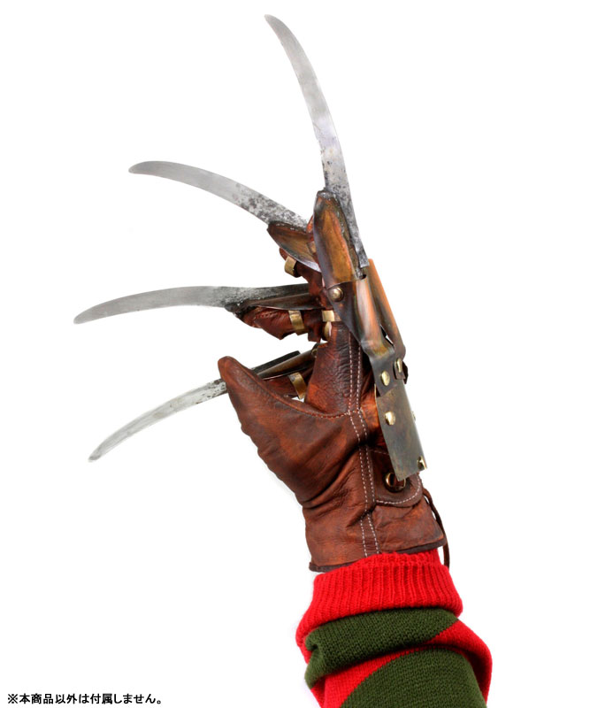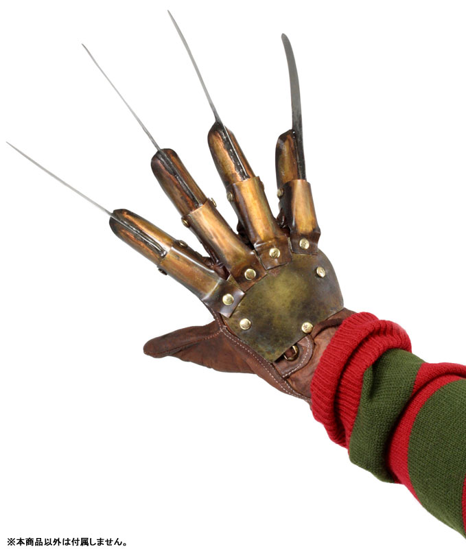 1作目から5年後を舞台に描かれた、1987年全米公開の『エルム街の悪夢』シリーズ3作目となる『エルム街の悪夢3 惨劇の館』。その劇中でフレディ・クルーガーが使用する、トレードマークとも言えるグローブのレプリカモデルが再び。金属製のかぎ爪部分は、質感あるフェイクレザーに鋲で留められリアル感のある仕様で、劇中でカチャカチャ鳴らしながら近づいてくるフレディの爪そのものの雰囲気。手の形をした簡易スタンドも付属し、映えるディスプレイも可能です!