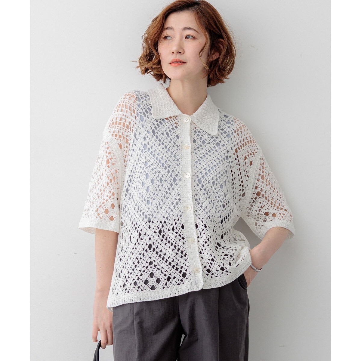 かぎ針編みのような刺繍レースが目を惹く、存在感抜群のポロカーディガンです。襟や前立てのシンプルな柄でトリミングすることで大人の女性でも上品に着こなせる一枚に仕上げました。身体のラインを拾いすぎない程よくゆとりのあるシルエットが、リラックス感のある着心地を叶えます。 ボタンを留めて一枚着風に着るのはもちろん、インナーにキャミソールやタンクトップを合わせて、カーディガンとして羽織るレイヤードスタイルもおすすめです。カラーは、清潔感があり顔周りを明るく見せるホワイト(#001)、シックで洗練された印象を与えるブラック(#005)、肌なじみが良くナチュラルな雰囲気のベージュ(#033)の3色展開です。