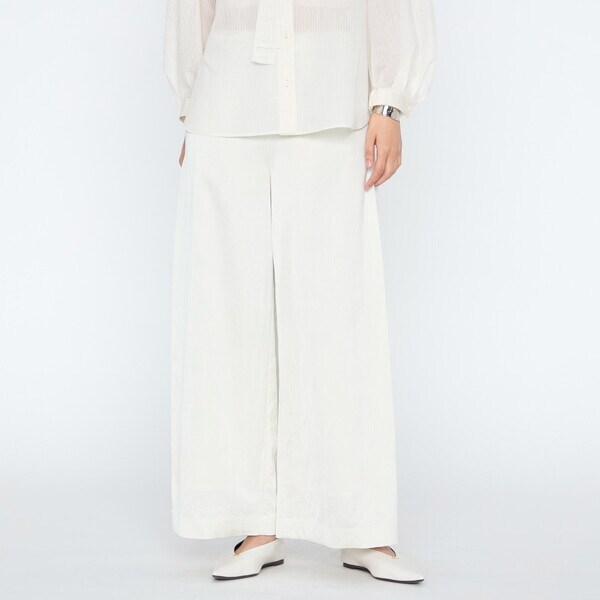 ウエストからヒップにかけてダーツですっきりと仕上げ、脇にサイドタックを入れてワイドパンツのボリューム感をコントロールし、シャープでエレガントなシルエットです。