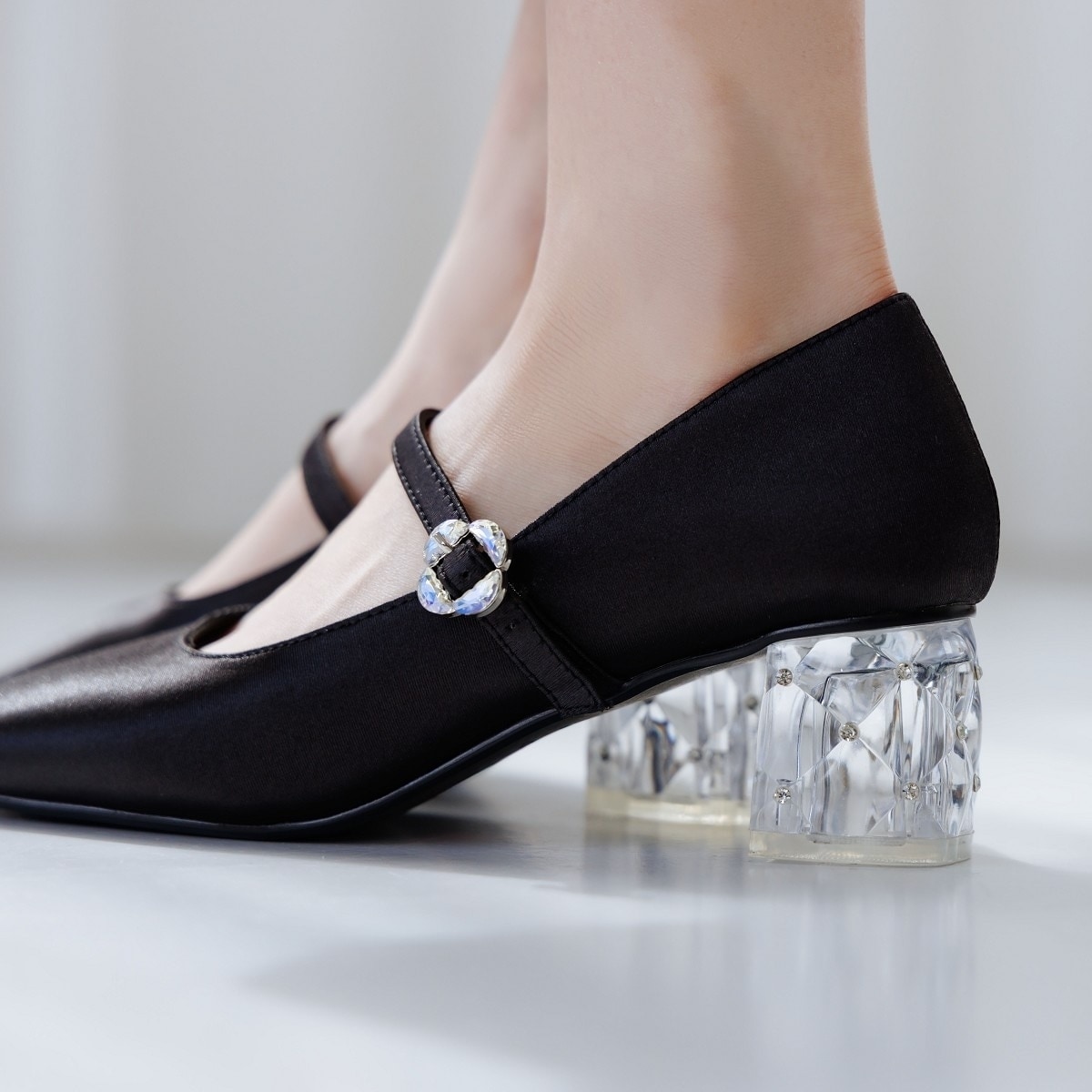 ジャストサイズで快適、幅まわりに当たりを感じることもありません。素材は柔らかく足に優しくフィットし、ストラップ部分がゴム仕様のため、さっとスムーズに脱ぎ履きできるのが魅力です。バックスタイルには控えめなきらめきがあり、さりげないポイントとして上品に映えます。ヒールは太めで安定感が高く、高さがあっても歩きやすそうなバランスに仕上がっています。