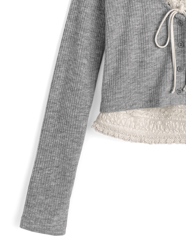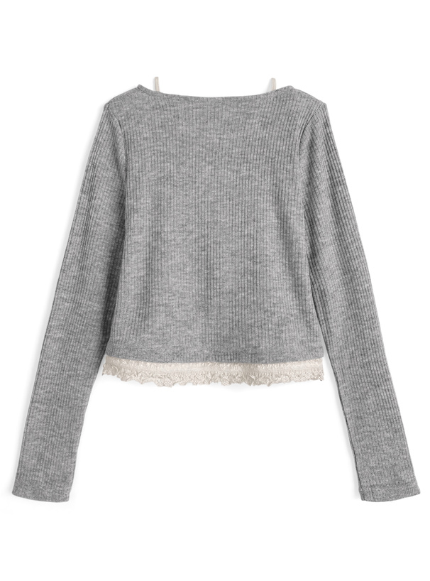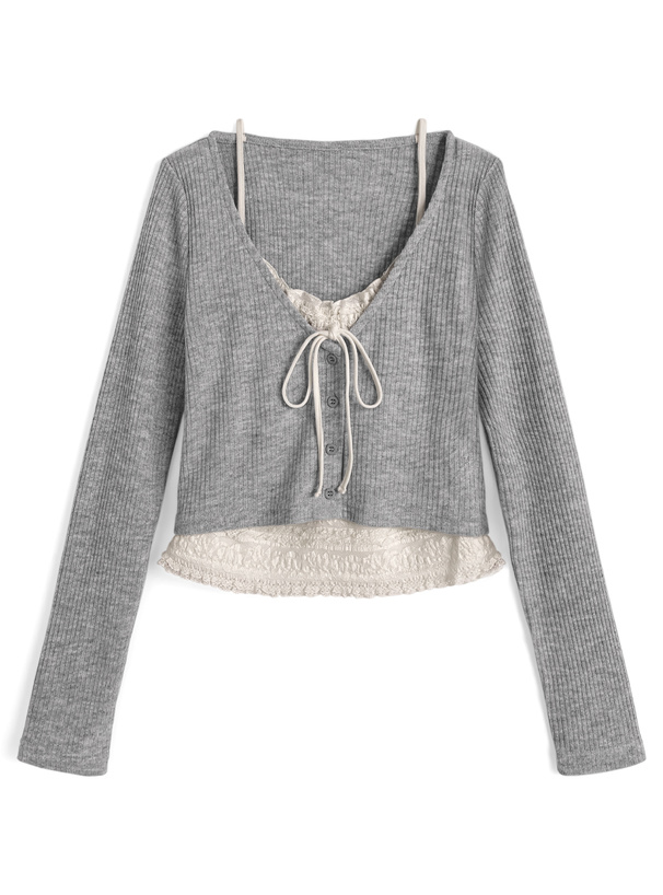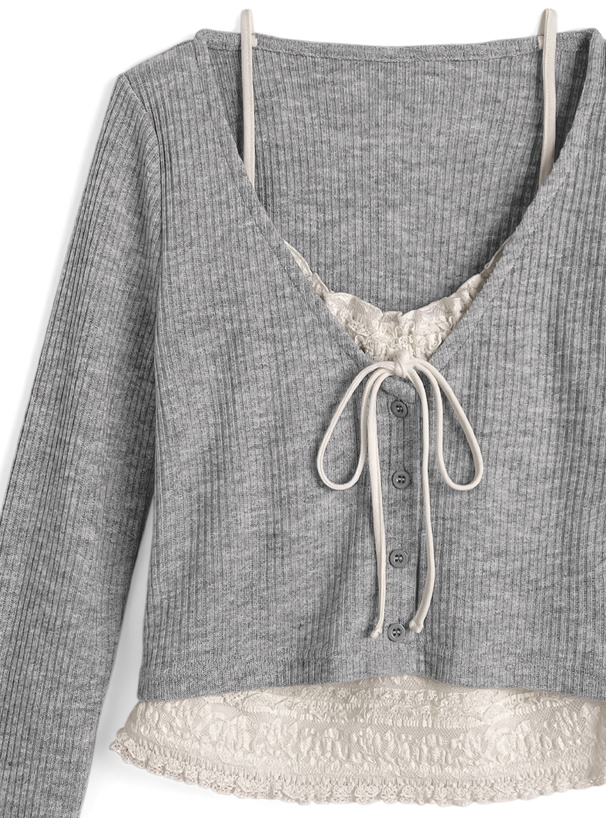 Vネックのカーディガンとレース素材のキャミを合わせたようなデザイン。