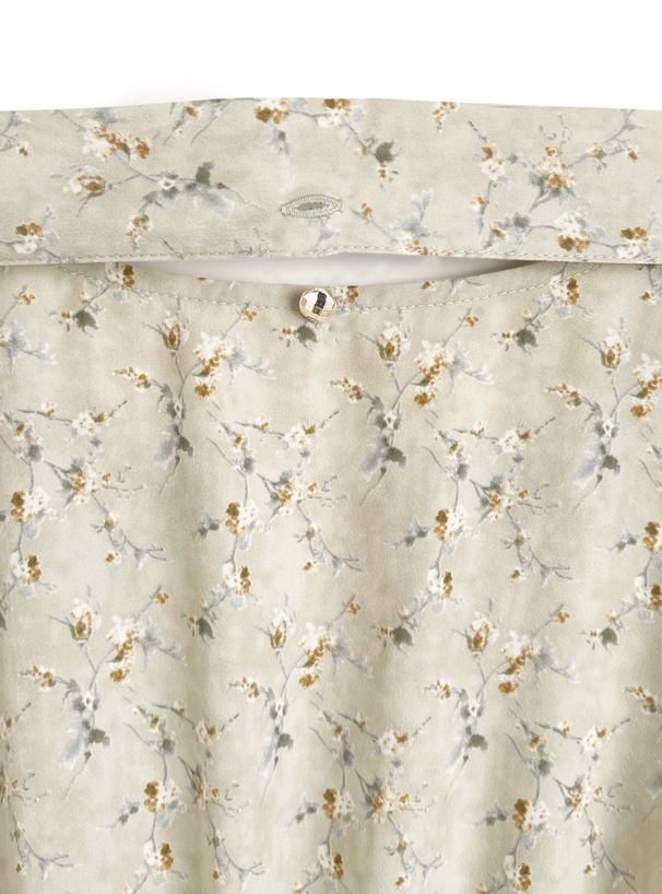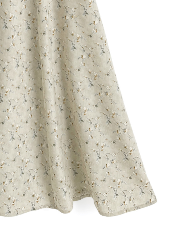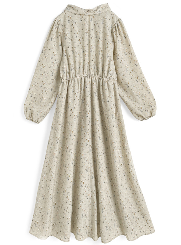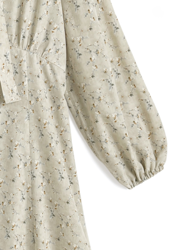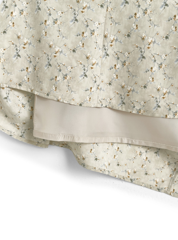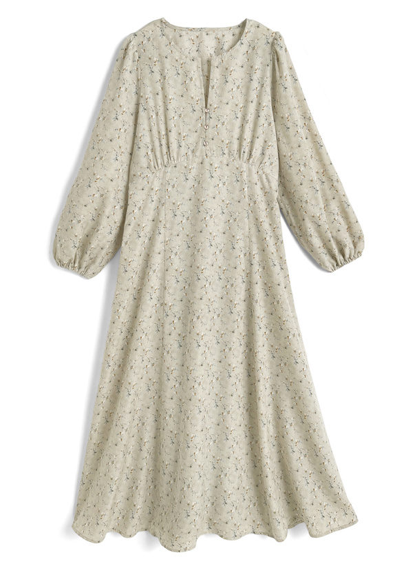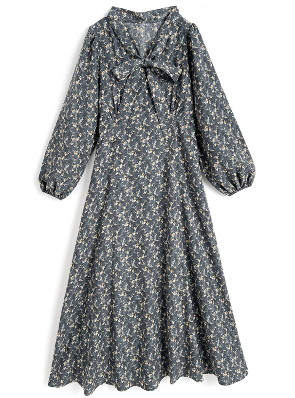 レトロチックなフラワー柄の生地で仕立てた品のあるワンピース。