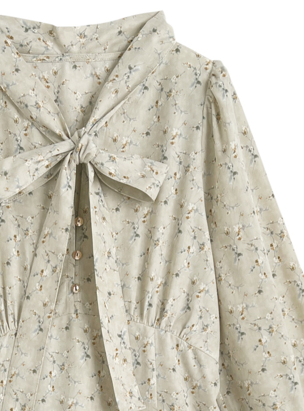 付属のリボンタイをつけてガーリーに、外してすっきりとしたキーネックでエレガントな着こなしも楽しめる。