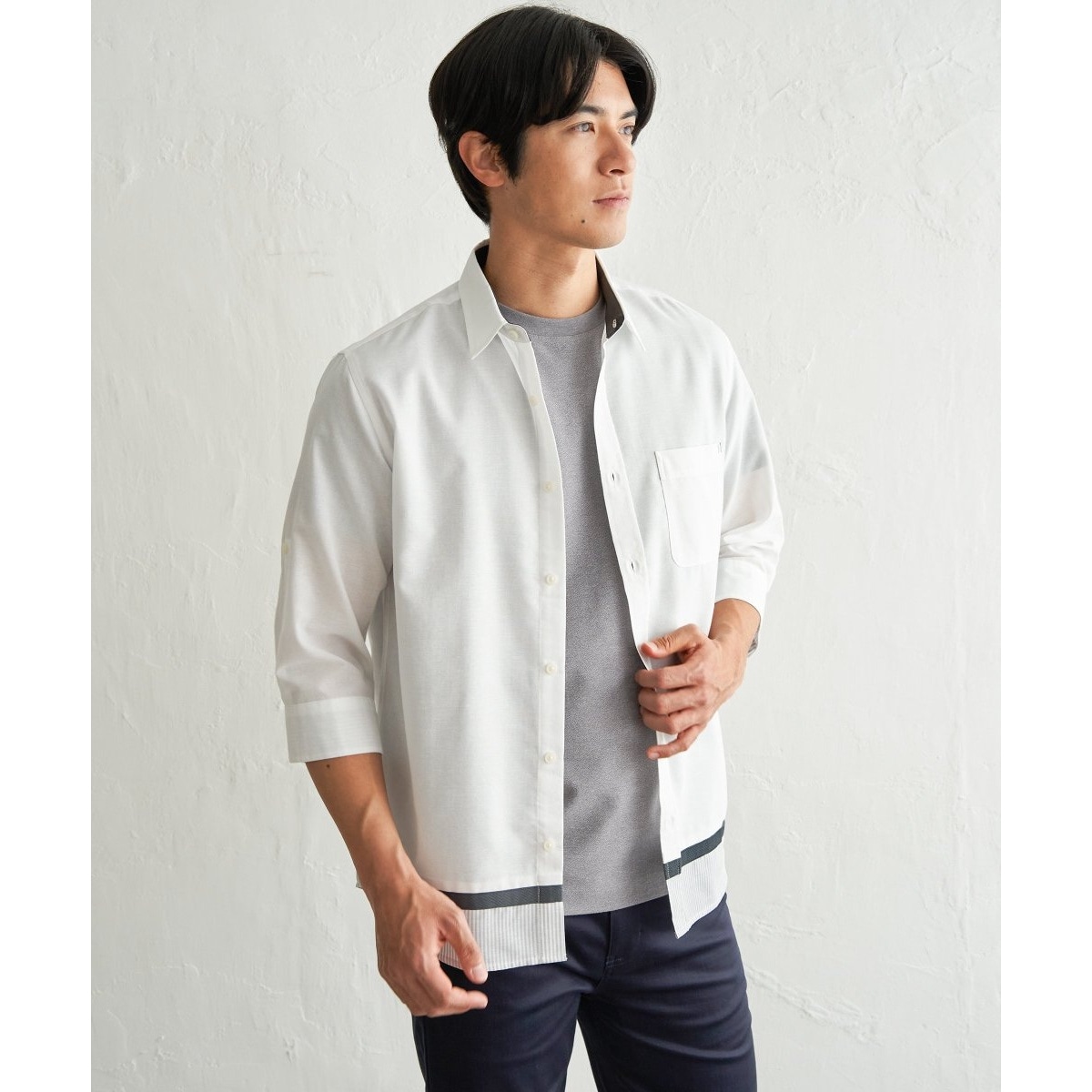 7分袖オックス裾切り替えシャツ