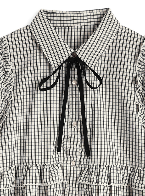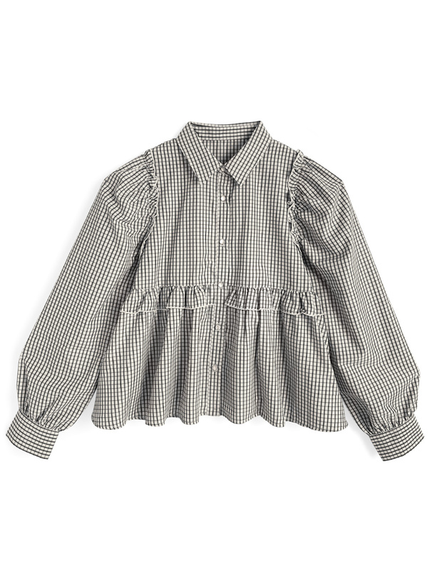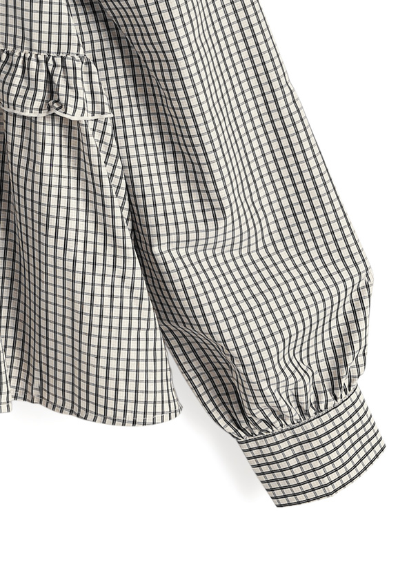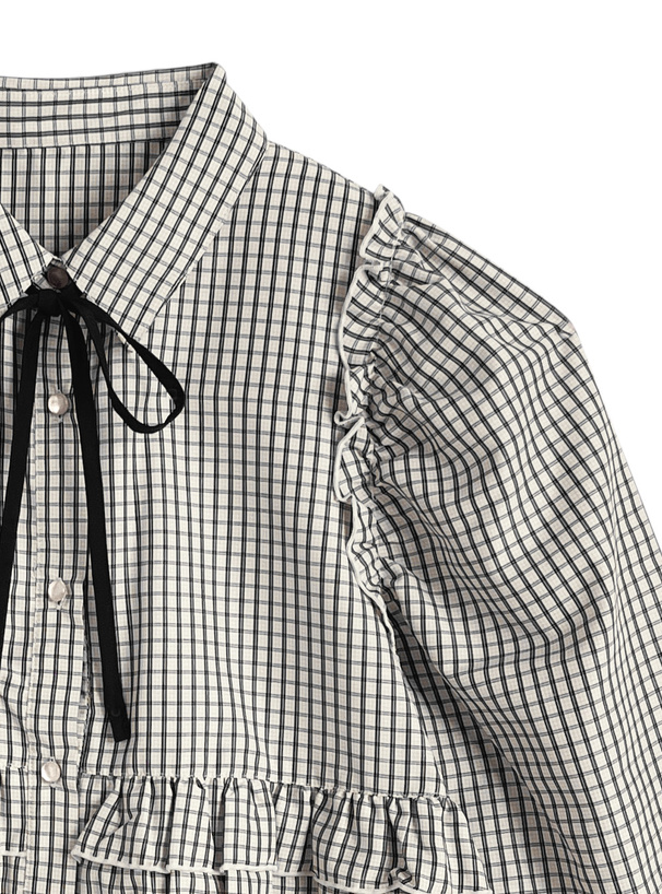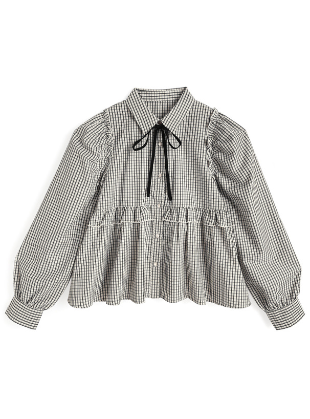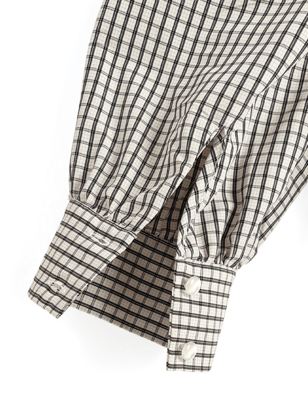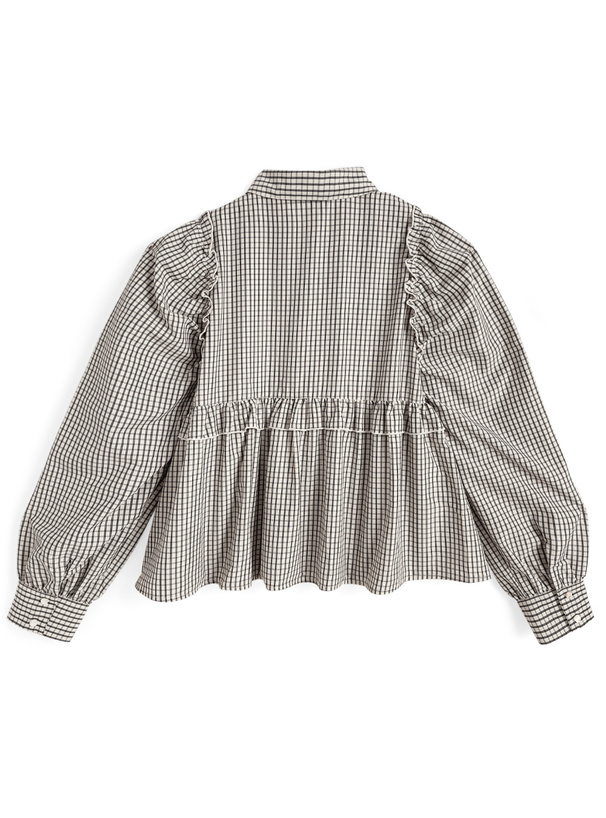 シックで落ち着ついた雰囲気の細かいチェック柄生地で仕立てたブラウス。