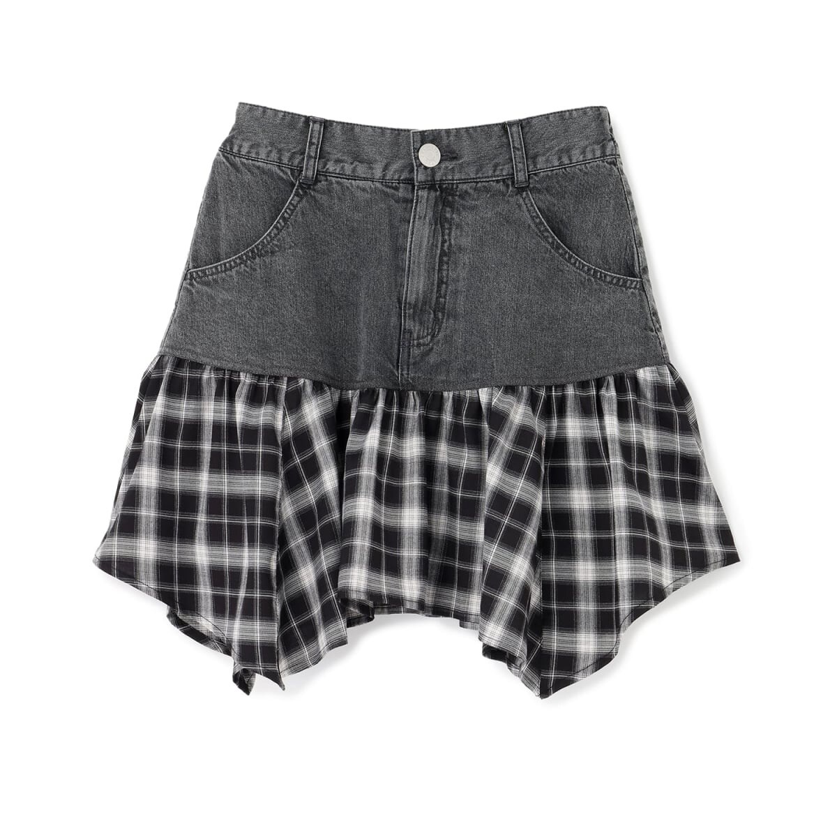 異素材合わせの変形ヘムが目を引く平成リバイバルな雰囲気のミニスカートです◎。