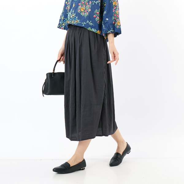 レーヨン麻ストレッチのギャザースカート。軽くて通気性が良く、伸縮性のある素材で、更にレーヨンが柔らかさを出しています。バルーンシルエットで、1枚でコーデにニュアンスを加えてくれる万能アイテム。両サイドのパイピングがさりげないアクセントになっています。ウエストはゴム&紐で快適な履き心地です。裏地付き。