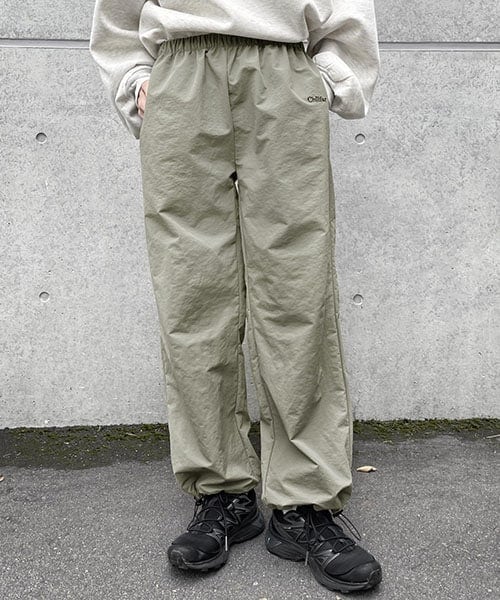 ウエストはスウェットをインできるくらいの余裕があり、ゴムなので楽にはくことができます。裾のドローコードをしぼってシルエットもお好みで変えることができます。
