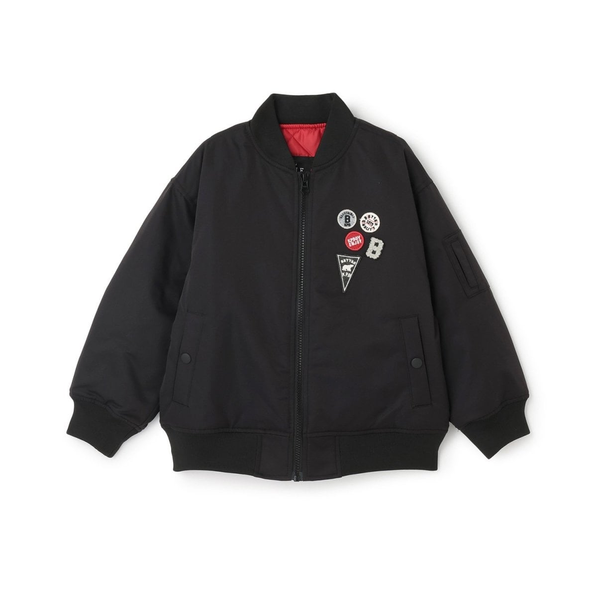 衿や袖、裾に編み立てリブを使用した、MA-1風のポリエステルツイルのジャケット。胸のワッペンや、背中の刺しゅうも凝った仕様です。左袖に付いた飾りのスリーブポケットも、雰囲気を引き立てます。中わたには、保温性に富んだサーモライトを使用し、軽くて温かい1着に仕上ました。