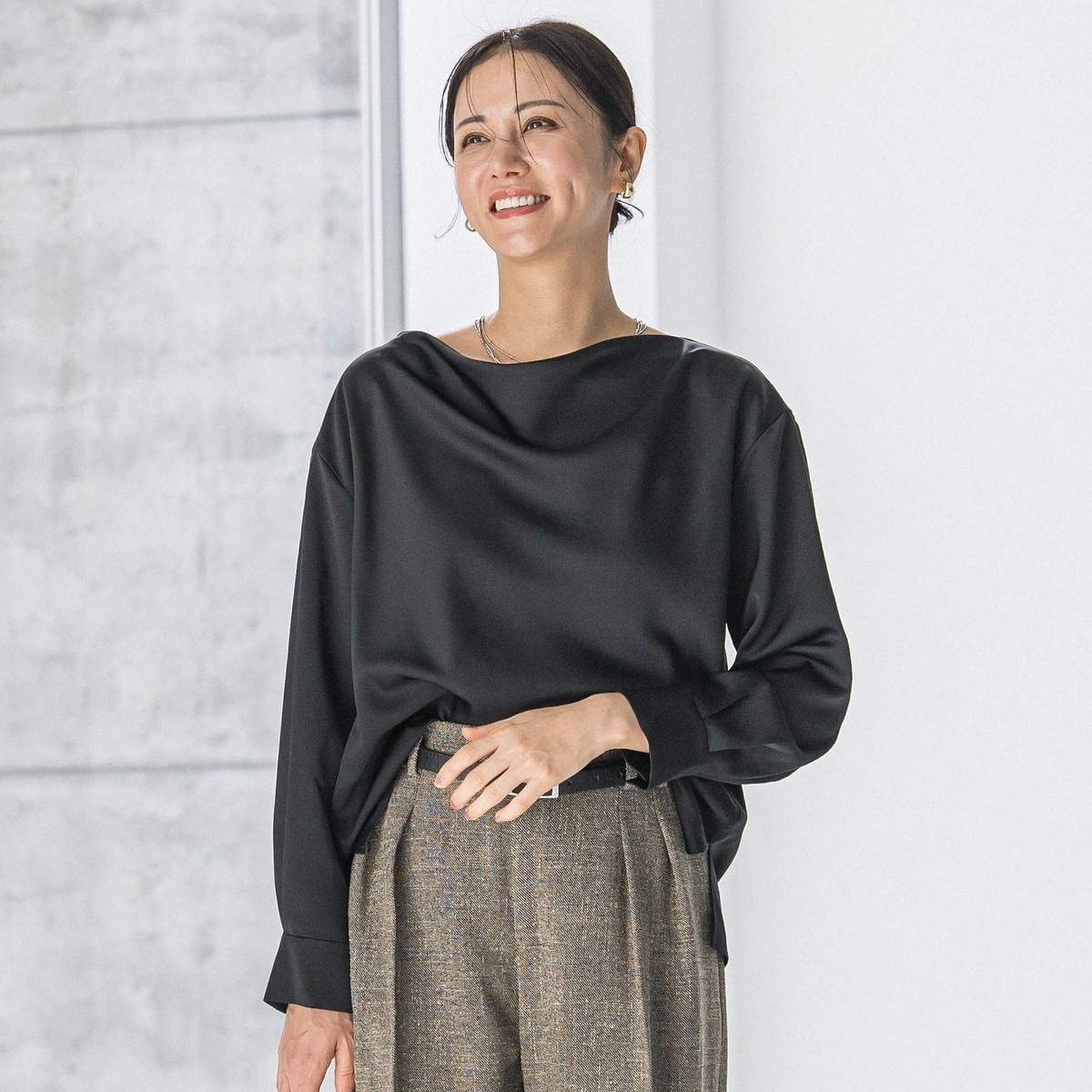 上品な光沢が魅力のサテンライク素材を使用した長袖ブラウス。
