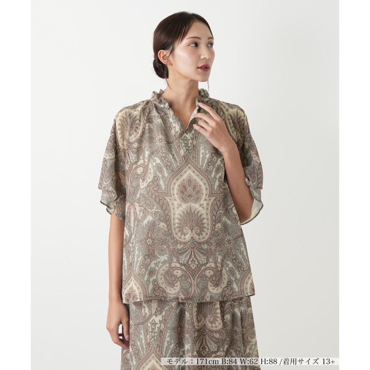 ヴィンテージライクなペイズリー柄のプリントが、秋のムードを高めてくれる華やかなスキッパーブラウス。顔周りを彩るフリルとすっきりと開いたネックが、甘さと抜け感の絶妙なバランスを生み出します。さらに軽やかなシアー素材も女性らしい柔らかな雰囲気を後押し。同素材のスカートと合わせれば、ワンピース見えするエレガントなセットアップも楽しめます。一枚で着こなしがぱっと華やぐ、主役級のトップスです。