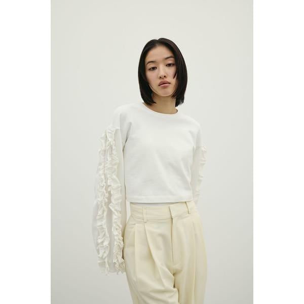 モデル身長166cm(FREEサイズ着用)シンプルながら袖に沿って施されたフリルが女性らしく華やかなフリルスリーブトップ。程よく厚みのあるカット素材を使用。カジュアルにもきれいめにも着まわせるデイリーに活躍する一枚です。短丈デザインでボトムとのバランスが取りやすく、ハイウエストパンツやスカートとの相性も抜群。透け感なし、ストレッチあり。【お手入れ方法】マシンウォッシュ可