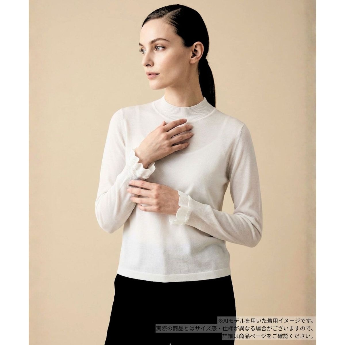 上品なハイネックと、袖口にあしらわれたフェミニンなフリルが特徴のニットプルオーバーです。袖口のフリル部分にのみ繊細なラメを混紡し、さりげなく煌めくエッセンスに。レイヤードにも使いやすいやや薄手の仕立てで伸縮性も備えており、快適な着心地を実感できます。一枚で着るのはもちろん、ジャケットやカーディガンのインナーとして袖口のフリルを覗かせるコーディネートもおすすめ。オンオフ問わず、冬のスタイリングをエレガントに彩るアイテムです。