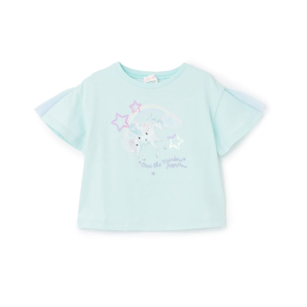 ユニコーンとレインボーの繊細なプリントに、キラキラ輝くパーツをトッピング♪ ゆったりとしたシルエットながら短い丈感のトレンドデザインです。