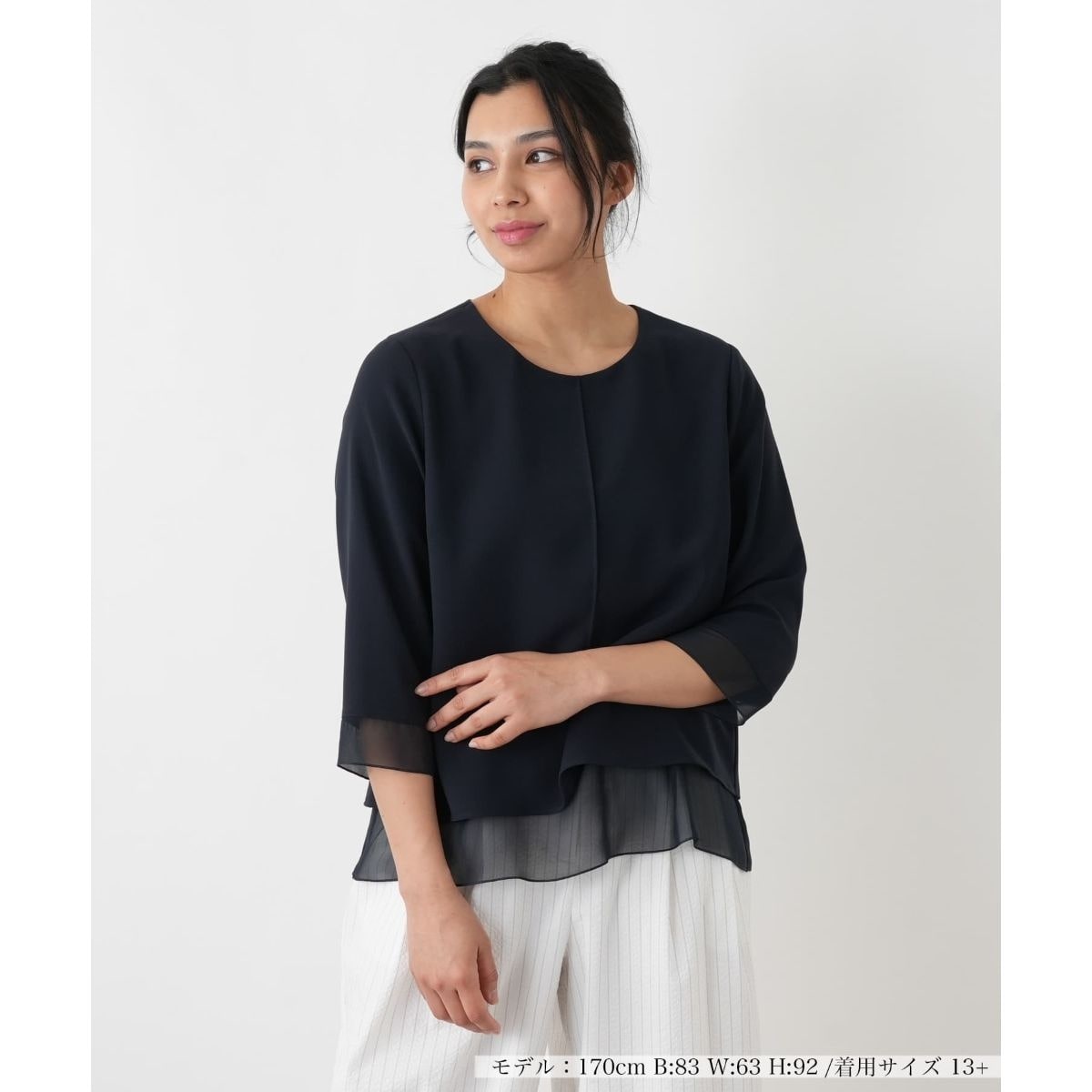 身頃を二枚重ねにすることで、まるでブラウスのような上品な見え方を実現したカットソーインナー。袖はふわりとしたシフォンジョーゼットを一枚仕立てにし、女性らしい優雅な透け感をお楽しみいただけます。袖口と裾にも透け素材を使用することで、軽やかな抜け感を演出。ご自宅でお手入れしやすい手軽さも兼ね備えています。ジャケットやカーディガンのインナーとしてはもちろん、これ一枚でも十分に華やかで、様になる万能アイテム。オンオフ問わず、様々なシーンで活躍してくれます。