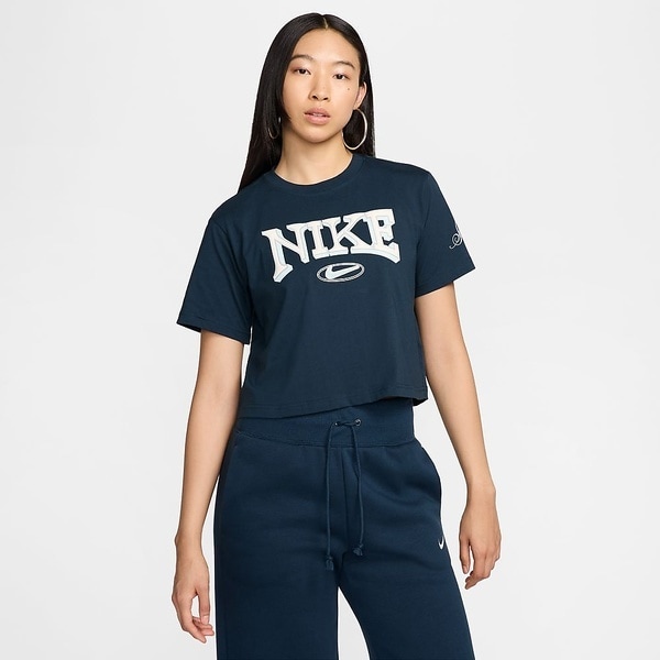 ウィメンズ ルーズ ショートスリーブ クロップド Tシャツ 柔らかくて軽いコットン素材を使用したこのバーシティスタイルのTシャツは、前面中央にテクスチャード加工のスウッシュロゴを配置。短めの丈で、フレッシュな着心地です。 More Details コットン100 シェニール織りのスウッシュロゴ 左袖と胸にプリントグラフィック 洗濯機洗い可能
