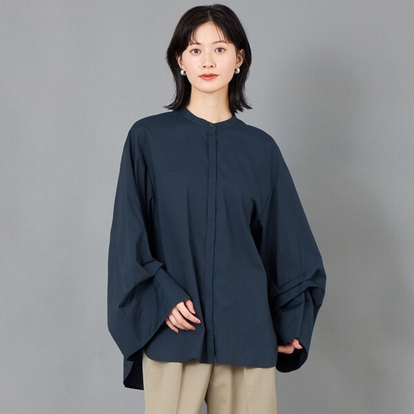 袖に大きなタックを取り、ボリューム感を持たせたシャツブラウス。