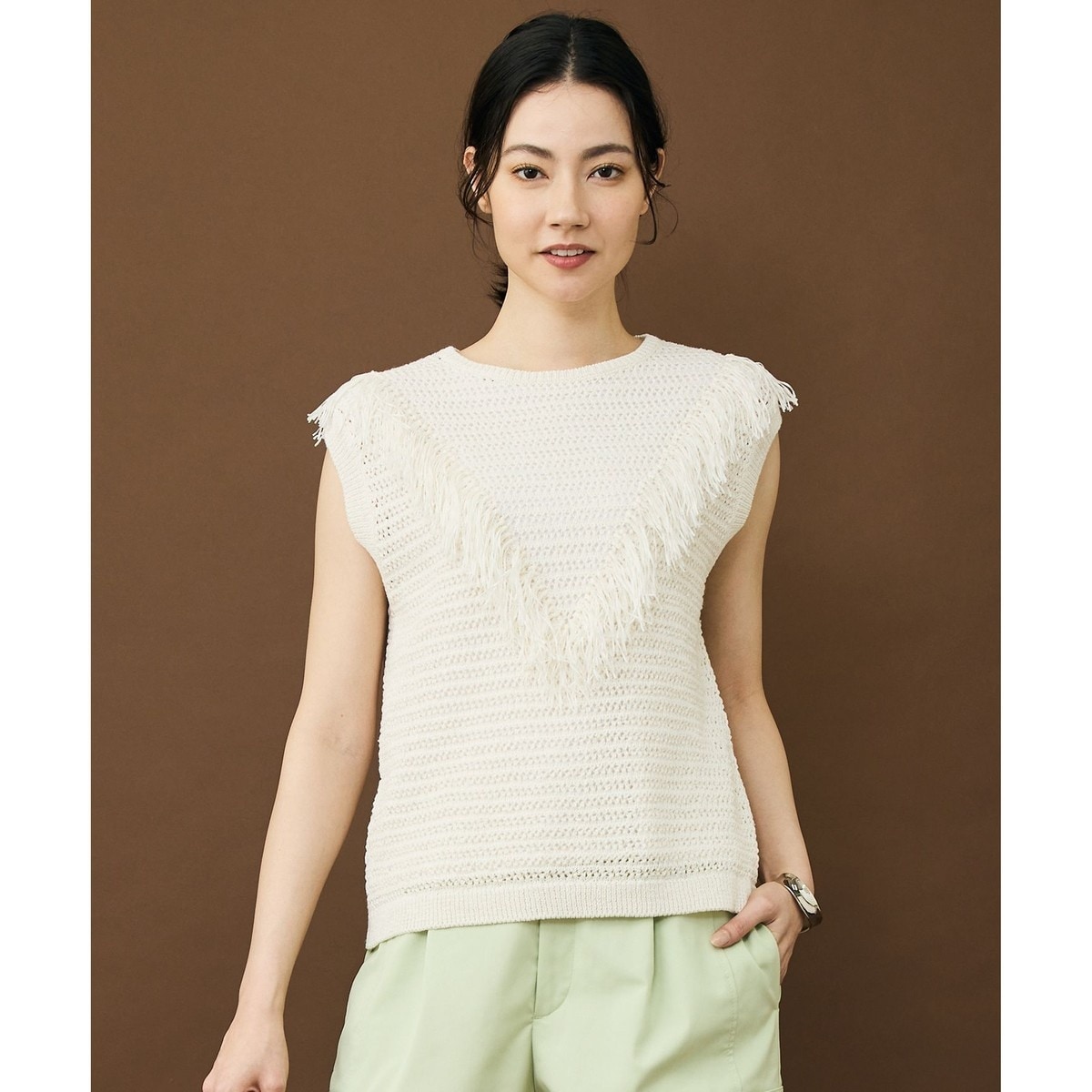 いつもの装いにアクセントをプラスするベスト■デザインかぎ針編みのようなクラフト感のある透かし編みが特徴のファンシーニットのベストです。前身頃にあしらったフリンジディテールが、着こなしのポイントになります。細いテープ状の糸を使用することで、程よい立体感を保ちながらも軽やかに仕上げ、シーズンムードを高める表情に仕上げています。シンプルなスタイリングに取り入れるだけで、アクセントになる一枚です。■素材天然素材を使用しており、平テープ状に編まれています。編み立てると立体感があり軽さが特徴です。軽やかに感じるドライタッチな風合いと清涼感がポイントで、春から盛夏まで快適に着用いただける素材です。