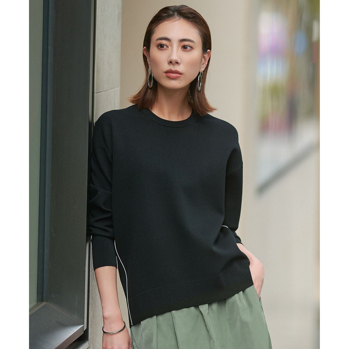 ■デザインゆったりリラクシーでスウェットライクなニットプルオーバー。ニットならではのコンパクトな目面、柔らかでスポンディッシュな表面感が、カジュアルすぎず高級感ある佇まいです。ボディーはゆったりながら袖周りはスッキリと、袖はリブ仕立てですが締め付け感のないサイジングで、すっきり見えしながらどんなボトムとも相性良く着ていただけます。ICBらしく脇に細めの配色ラインを入れてモダンでモードなエッセンスをプラスし、シンプルながらさりげないディティールが光る汎用性の高いニットトップスに仕上げました。脇の配色ラインは、ブラック(005)とトープ(042)がオフホワイト、ダークブラウン(035)がネイビー、ネイビー(075)がブラウンです。