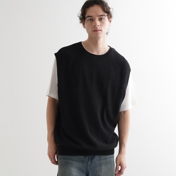 リネンライクなベストと半袖Tシャツセット。