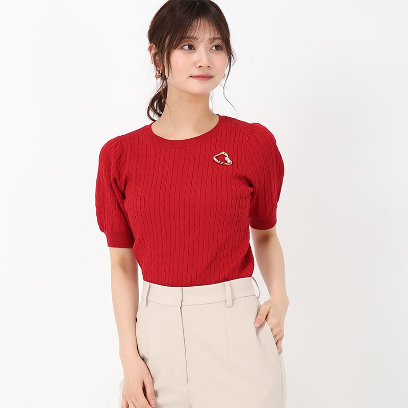 胸元にアクセントをプラスするブローチ付きのケーブルニット。柔らかなふくらみのあるパフスリーブがフェミニンな雰囲気を演出。細身のケーブル模様ですっきりと品よくスタイリングすることができます。ブローチは取り外し可能です。■fabric透け感[やや有り]裏地[無し]伸縮性[有り]生地の厚さ[普通]