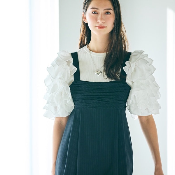 ・シャツ素材のミルフィーユ状の袖をドッキングしたニットプルオーバー。