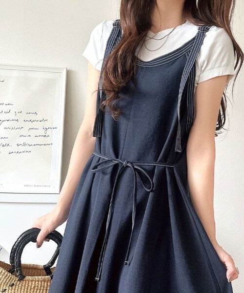 【接触冷感・吸水速乾・UVカット・防シワ機能付き】キーネックリボンティアードワンピース