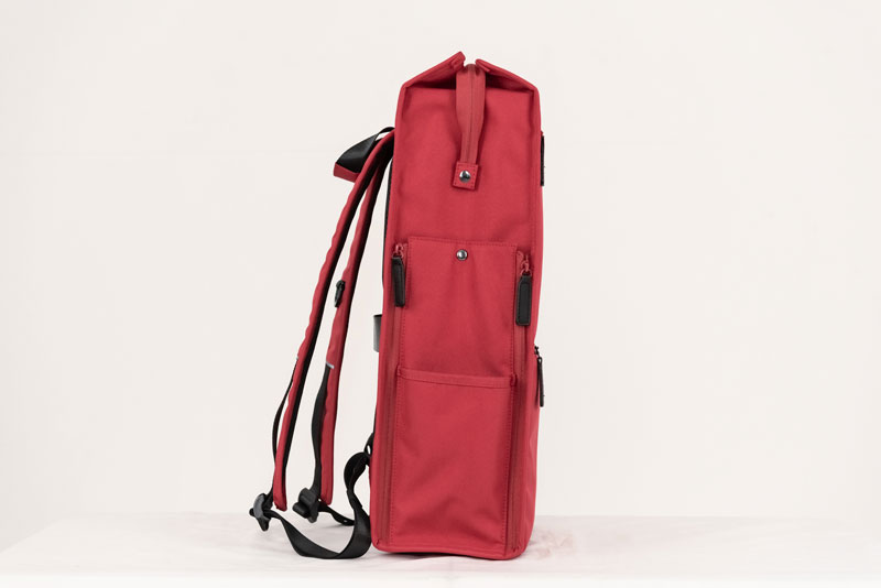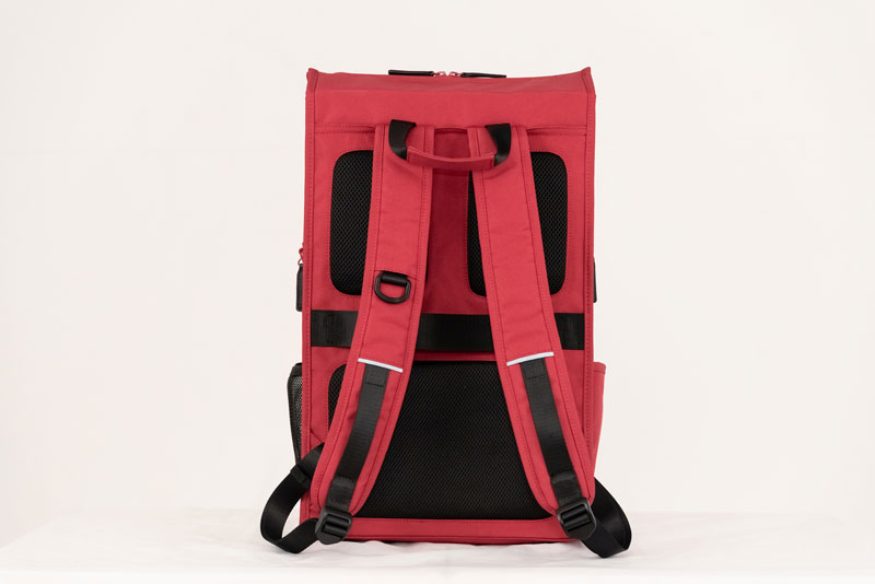 メインコンパートメントは22Lで、一泊二日ほどの旅行にも対応できる安心のサイズ感となり、内部にはノートPC・タブレットを収納できるクッション付きポケットや、小物類を整理しやすい複数のポケットとペン差しに加え、荷物を二層に分けられる折り畳み式の仕切りも搭載していますので、大きいバッグにありがちな“中で荷物が散乱する”という問題も起こりません。
