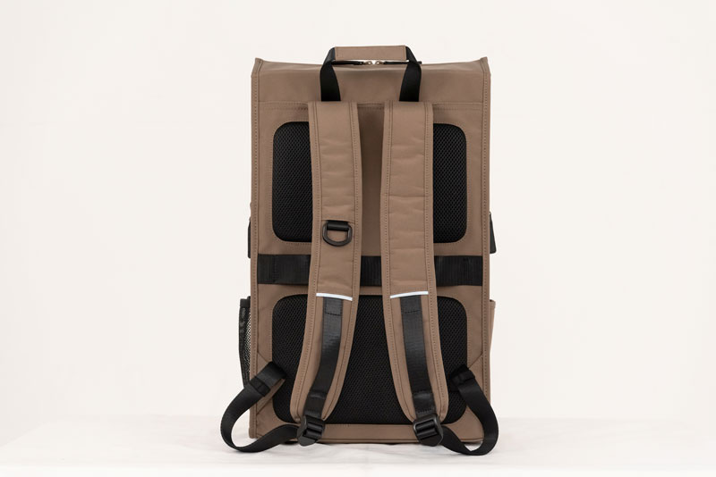 メインコンパートメントは22Lで、一泊二日ほどの旅行にも対応できる安心のサイズ感となり、内部にはノートPC・タブレットを収納できるクッション付きポケットや、小物類を整理しやすい複数のポケットとペン差しに加え、荷物を二層に分けられる折り畳み式の仕切りも搭載していますので、大きいバッグにありがちな“中で荷物が散乱する”という問題も起こりません。